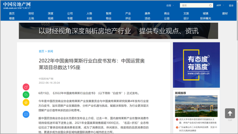 會(huì)后,國(guó)內(nèi)主流權(quán)威媒體紛紛在第一時(shí)間通過(guò)各自官方平臺(tái)及渠道發(fā)布此次活動(dòng)盛況及內(nèi)容。截止6月23日,共計(jì)近百家媒體在全網(wǎng)發(fā)布、轉(zhuǎn)載“2022年中國(guó)奧特萊斯行業(yè)白皮書(shū)線上發(fā)布”相關(guān)報(bào)道及新聞百余次,全網(wǎng)累積點(diǎn)擊閱讀量近五百萬(wàn)次。