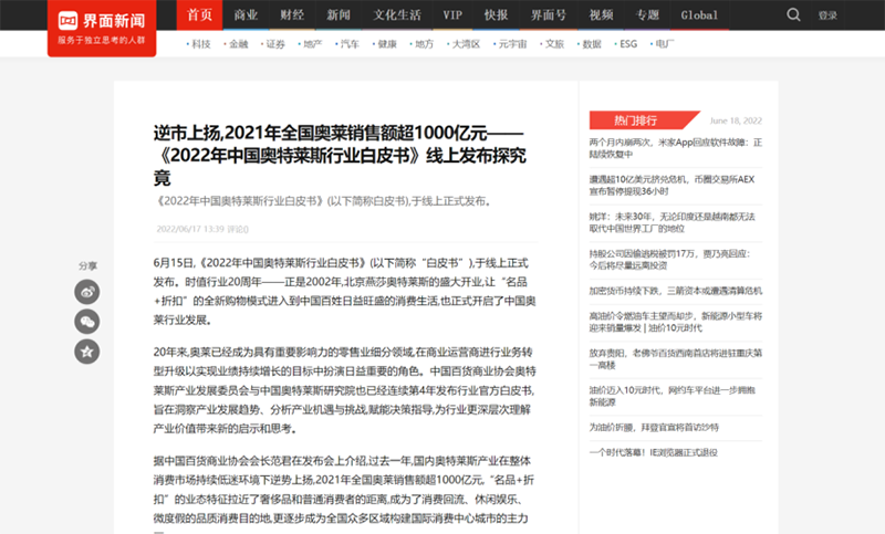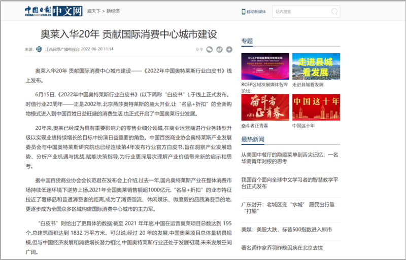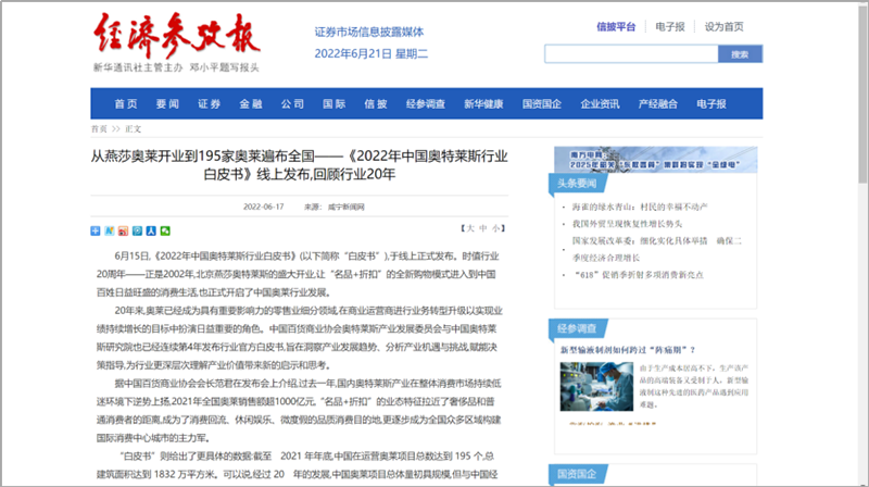 2022年6月15日,中國(guó)百貨商業(yè)協(xié)會(huì)奧特萊斯產(chǎn)業(yè)發(fā)展委員會(huì)線上直播發(fā)布《2022年中國(guó)奧特萊斯行業(yè)白皮書(shū)》。白皮書(shū)中“2021年中國(guó)零售市場(chǎng)最新發(fā)展、中國(guó)奧萊20年全覽、2021年中國(guó)奧萊市場(chǎng)發(fā)展、中國(guó)奧萊展望和政策建議、專家訪談”等內(nèi)容吸引政府領(lǐng)導(dǎo)、專業(yè)機(jī)構(gòu)、產(chǎn)業(yè)運(yùn)營(yíng)商、品牌商、服務(wù)商、媒體記者及眾多奧萊消費(fèi)者共計(jì)20余萬(wàn)人參會(huì),成為國(guó)內(nèi)奧萊行業(yè)年度一大焦點(diǎn)。