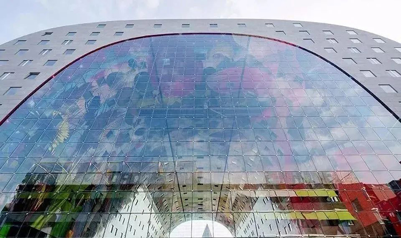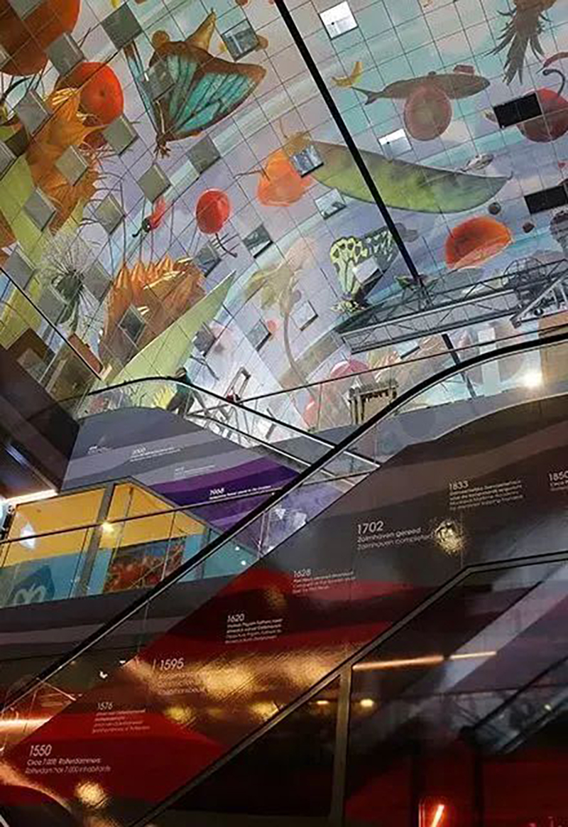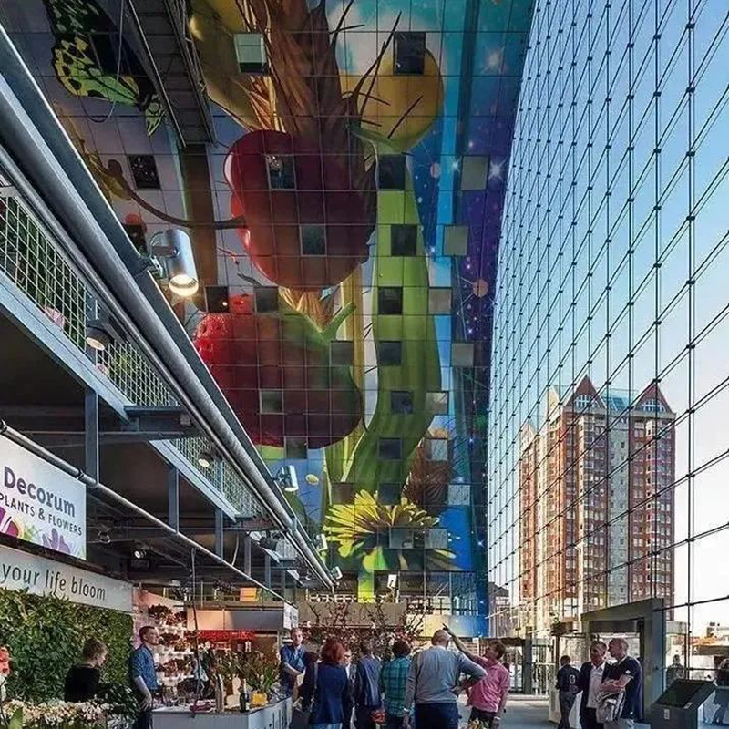 建筑弧形的內(nèi)面11000㎡的彩色藝術(shù)品“豐饒之角”,是由Arno Coenen和Iris Roskam創(chuàng)作而成,將水果、魚(yú)、面包、鮮花與附近的大教堂等元素重疊交織而成。項(xiàng)目除兼?zhèn)鋫鹘y(tǒng)菜市場(chǎng)銷(xiāo)售食材的功能外,消費(fèi)者還能在“美食市集”享受餐飲的服務(wù)和游逛的體驗(yàn),大大滿足人們的訴求。