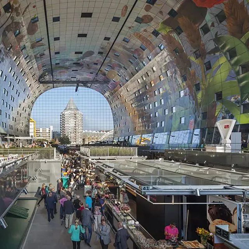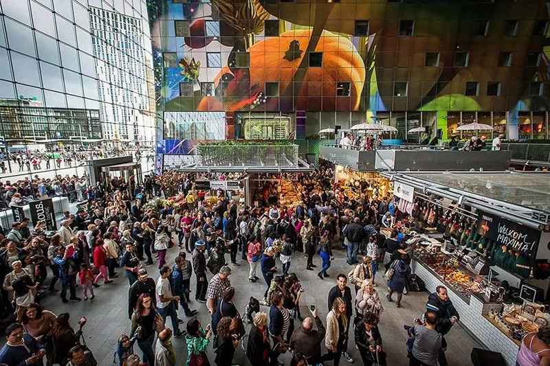 開(kāi)創(chuàng)「美食市集」先河的荷蘭Markthal市場(chǎng),自2014年開(kāi)業(yè)以來(lái),就受到全球各界人士的關(guān)注,年均吸引參觀游客達(dá)4.5-7百萬(wàn)人次。作為荷蘭全國(guó)第一家室內(nèi)市集,以及結(jié)合居住和購(gòu)物的新城市建筑類(lèi)型,成功從傳統(tǒng)的菜市場(chǎng)轉(zhuǎn)型為具備藝術(shù)性的文藝空間、生活集市、展覽空間、創(chuàng)意工作室、綠色休閑空間以及特色居住單元空間。