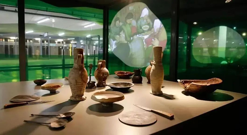 項(xiàng)目舊址在1940年的一次戰(zhàn)爭(zhēng)中歷史建筑都被摧毀,Markthal市場(chǎng)再建設(shè)時(shí),地下考古團(tuán)隊(duì)發(fā)現(xiàn)了各種各樣的中世紀(jì)物品。為予以紀(jì)念,便以垂直展覽的形式在市場(chǎng)內(nèi)的自動(dòng)扶梯上展示。