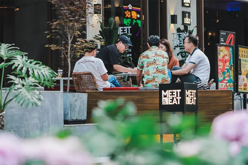 在國(guó)內(nèi),傳統(tǒng)美食廣場(chǎng)逐漸黯淡退場(chǎng),人們更希望在美食消費(fèi)場(chǎng)景享受到輕松愉悅的聚會(huì)和社交。MEET&EAT的創(chuàng)造團(tuán)隊(duì)比褐就通過(guò)突出“MEET”的“人與人之間的社交”來(lái)塑造場(chǎng)景。為突出社交感,則放大公區(qū)外部的階梯座位,也使之與成都的街巷文化進(jìn)行融合。