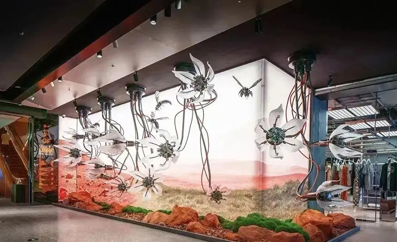 正如北京SKP-S內(nèi)的“未來(lái)農(nóng)場(chǎng)”以仿生羊?yàn)榱咙c(diǎn),成都“平行世界”里猩猩漫步太空引人遐想,武漢SKP亦在負(fù)一層SKP-S精心構(gòu)建了特色主題藝術(shù)空間《EARTH 2124》。該空間巧妙劃分為三大區(qū)域:北極熊區(qū)《無(wú)邊的浮冰》,寓意著冰川的消融與生命的掙扎;走廊區(qū)《新大陸架》,象征著未來(lái)世界的重構(gòu)與探索;企鵝區(qū)《覆羽》,則是對(duì)極地生物適應(yīng)環(huán)境、重獲新生的美好愿景。整個(gè)空間緊扣“以未來(lái)之眼審視全球變暖,攜手極地生靈共繪新篇章”的深刻主題。