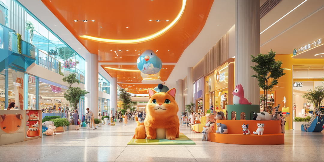 A場景:位于寵物友好購物中心一層,連接室內(nèi)外區(qū)域有家寵物零售店,店門口提供寵物推車,貨品陳列展臺(tái)尤其是寵物玩具類展臺(tái)略高于寵物推車,與寵物視線基本持平。店鋪店員自帶友好氣質(zhì),對(duì)來訪寵物的主動(dòng)親親貼貼毫無抵抗力。店內(nèi)到處可見主人們各自推著小車帶著貓貓狗狗,三三兩兩聚在一起聊著自家寶貝的名字、習(xí)慣與性格。直接進(jìn)入商場或從店鋪進(jìn)入商場都無需回避安保人員的“眼神拷問”,符合城市飼養(yǎng)規(guī)范的寵物均可自由進(jìn)場。