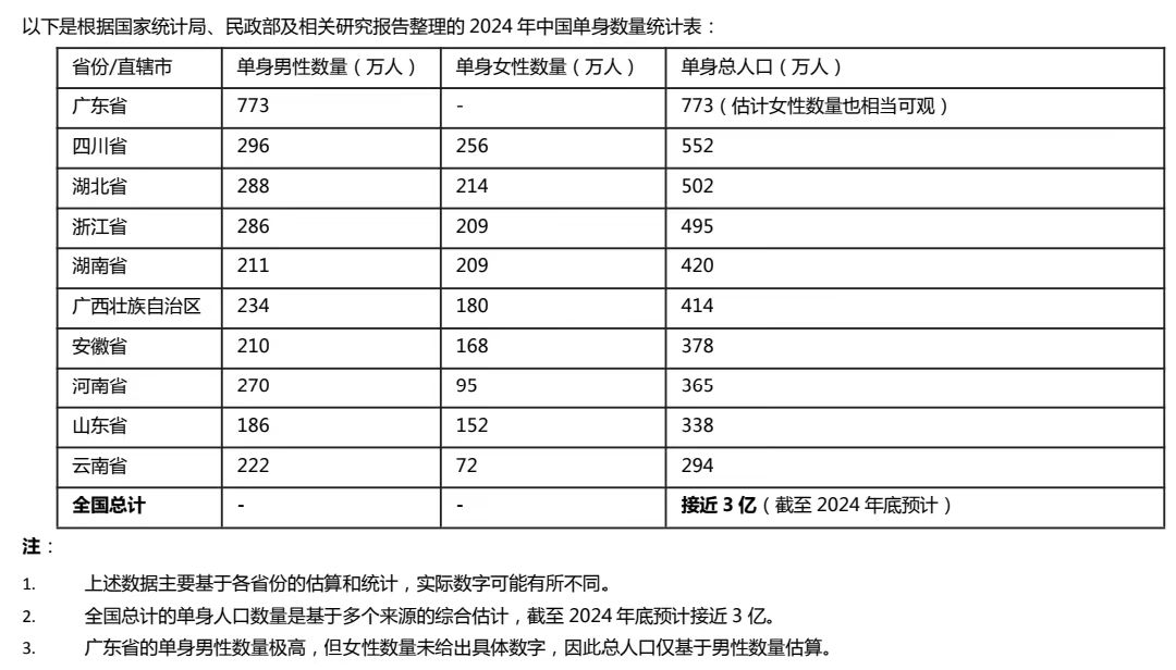 根據(jù)國(guó)家統(tǒng)計(jì)局和《中國(guó)人口和就業(yè)統(tǒng)計(jì)年鑒》的相關(guān)報(bào)告,2022到2023年期間,中國(guó)單身人口數(shù)量已經(jīng)達(dá)到2.4億,并且根據(jù)推測(cè),2024年單身人口將達(dá)到3億,這就意味著每四個(gè)中國(guó)人中就有一個(gè)單身。