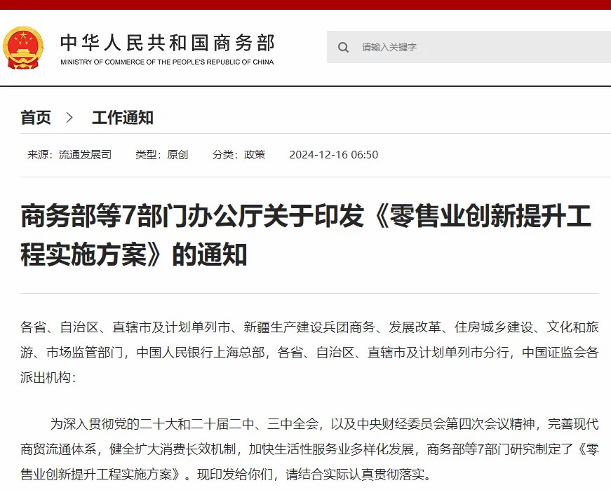 對實體商業(yè)而言,12月16日,商務(wù)部等七部門辦公廳聯(lián)合印發(fā)《零售業(yè)創(chuàng)新提升工程實施方案》(以下簡稱《方案》),旨在推動商業(yè)場景化改造、多元化業(yè)態(tài)融合創(chuàng)新、品質(zhì)化產(chǎn)品和服務(wù)供給、數(shù)字化賦能、產(chǎn)業(yè)鏈協(xié)同降本增效。