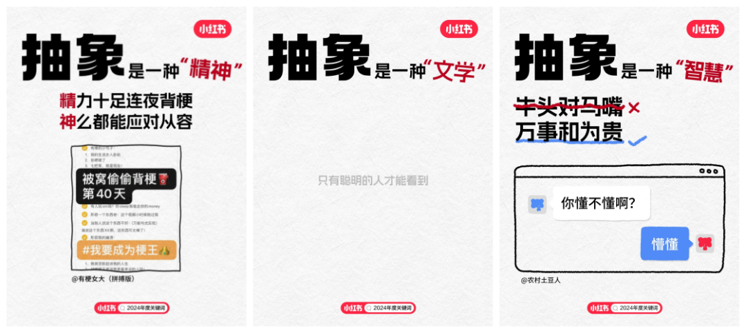 隨著2024年度關(guān)鍵詞“搞抽象”在小紅書上的火爆,我們不難發(fā)現(xiàn),無論是用戶對(duì)于生活哲學(xué)的深度探索,還是對(duì)于藝術(shù)、文化乃至日?,嵥槭挛锏莫?dú)特詮釋,都以一種前所未有的熱情被記錄與分享。