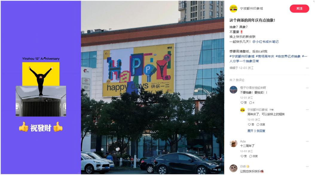 對(duì)于多數(shù)購物中心而言,因其目標(biāo)客群相對(duì)寬泛,通過抽象文化形成“群體認(rèn)同感”的難度比品牌方更高。所以,購物中心的抽象式營(yíng)銷,既要出圈,又不能過于小眾。購物中心官方發(fā)布的一條小紅書筆記能讓用戶一眼看懂,并愿意發(fā)聲回應(yīng),如此才是有效“抽象”。