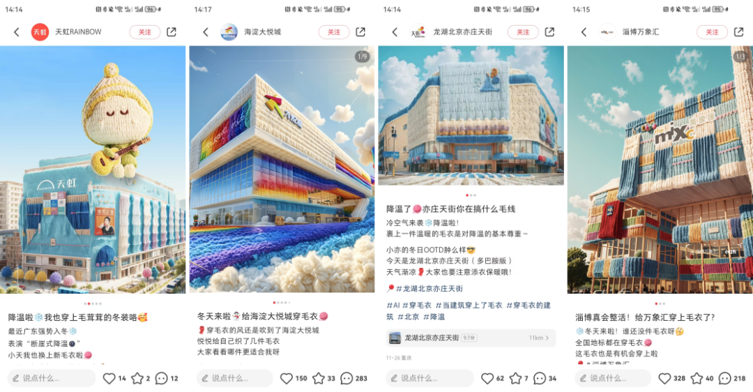 還記得今年冬天那些“穿毛衣”的購物中心嗎?首先發(fā)布的一波AI制圖“購物中心穿毛衣”海報(bào),確實(shí)有些以假亂真,讓很多消費(fèi)者看到了一群可可愛愛的商場(chǎng)。這些購物中心將主形象通過“穿毛衣”這一事件變得更加擬人化,靠不同的“穿搭風(fēng)格”烘起線上平臺(tái)的話題討論熱度,也讓消費(fèi)者看到了官方的親近與真誠。