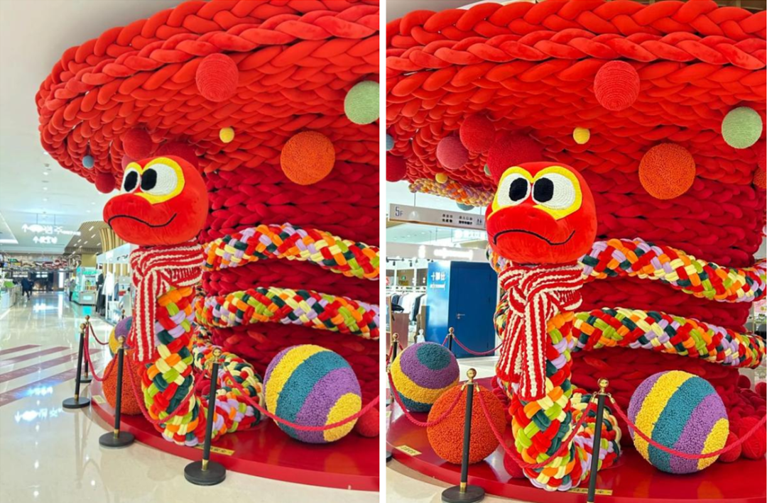 在即將到來的蛇年,購物中心開始陸續(xù)安排上了蛇年美陳。北京世紀金源購物中心也不例外。它選擇將毛線與蛇元素相結(jié)合,帶來一棵神蛇許愿樹。整棵樹都由毛線編織纏繞而成,五彩斑斕的神蛇盤繞許愿樹,還給自己帶上了一條圍巾,略顯可愛,也不失喜慶的氛圍。